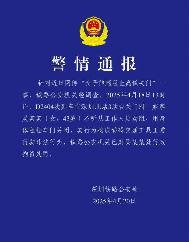 4月18日,一段“女子伸腿阻止高鐵關(guān)門”的視頻在網(wǎng)絡(luò)上引起熱議。視頻中,一名女性旅客強(qiáng)行用身體阻攔車門,兩名工作人員極力制止卻未能成功,直到三名同行人上車才離開車門,隨后列車關(guān)門駛離。4月19日,“@廣鐵集團(tuán)深圳北火車站”發(fā)布情況說(shuō)明,證實(shí)網(wǎng)傳視頻屬實(shí),并稱未造成列車晚點(diǎn),相關(guān)部門已介入調(diào)查。輿論要求嚴(yán)懲行為人呼聲較高,部分網(wǎng)民不滿工作人員制止不力,對(duì)相關(guān)法律規(guī)章制度未嚴(yán)格執(zhí)行。4月20日,深圳鐵路公安處官方微博通報(bào)稱,旅客吳某某行為構(gòu)成妨礙交通工具正常行駛違法行為,已被行政拘留。主流輿論點(diǎn)贊警方處置及時(shí),并圍繞“攔門事件何時(shí)休”展開討論。如中國(guó)網(wǎng)發(fā)文建議,修訂《鐵路安全管理?xiàng)l例》,明確阻礙發(fā)車的量化處罰標(biāo)準(zhǔn),如按延誤時(shí)長(zhǎng)階梯式罰款。上觀新聞、紅網(wǎng)發(fā)文稱,鐵路部門應(yīng)加大處罰力度,將“危害安全行為”納入個(gè)人征信系統(tǒng)、列入限行“黑名單”,形成更強(qiáng)的震懾效應(yīng)。