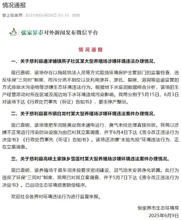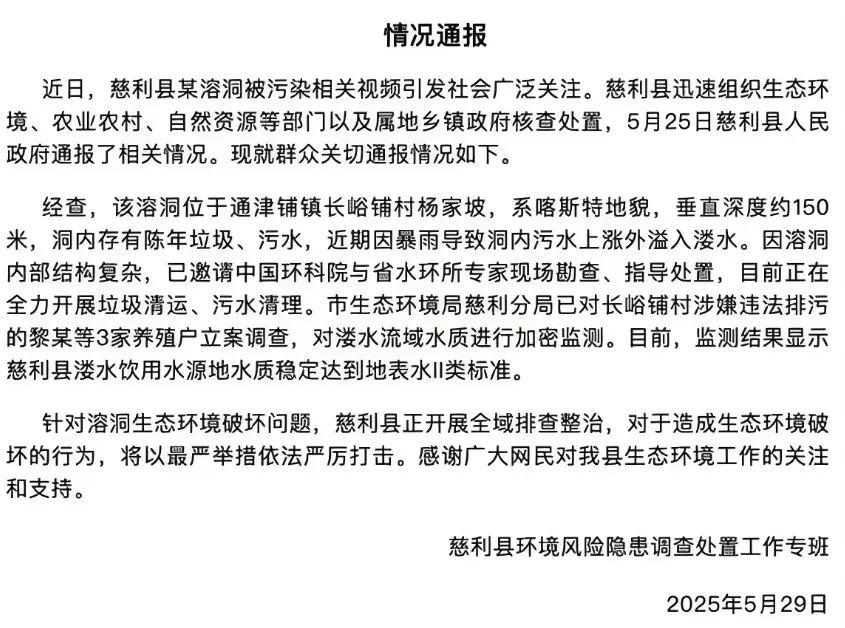 5月22日,“慈利發(fā)布”發(fā)文稱,近期發(fā)現(xiàn)長潭河電站大壩上游出現(xiàn)大面積渾濁污水,初步排查是從楊家坡溶洞溢流至溇水所致,執(zhí)法人員正在排查周邊區(qū)域環(huán)境違法行為。5月25日,“慈利發(fā)布”通報工作進展,稱已經(jīng)對多家養(yǎng)殖場指導立行立改,同時對涉嫌失職瀆職的相關責任人員同步啟動責任倒查。5月28日,張家界市生態(tài)環(huán)境局工作人員向媒體表示,他們很早就接到了對溶洞排污事件的投訴,從4月中旬開始一直在進行調查處理,最新調查進展將及時通報。5月29日,慈利縣再次發(fā)布情況通報稱,當?shù)厣鷳B(tài)環(huán)境局已對涉嫌違法排污的3家養(yǎng)殖戶立案調查。經(jīng)水質監(jiān)測,慈利縣溇水飲用水源地水質穩(wěn)定達到地表水Ⅱ類標準。