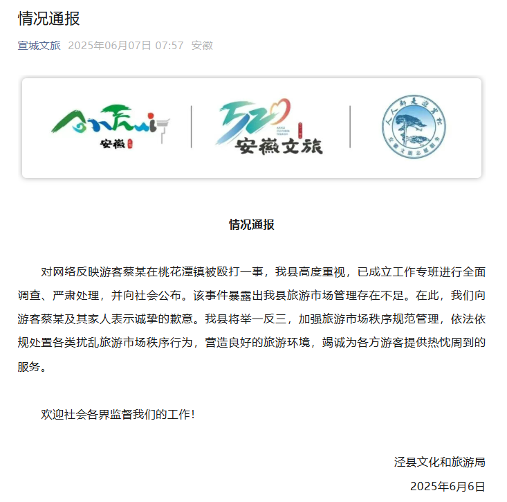 6月7日0時(shí)許,涇縣文化和旅游局發(fā)布情況通報(bào)稱,已成立工作專班進(jìn)行全面調(diào)查,向游客蔡某及其家人致歉。但輿論怒火并未完全平息,不少網(wǎng)民表示不能僅讓文旅部門“背鍋”,當(dāng)?shù)毓矙C(jī)關(guān)應(yīng)深入調(diào)查、嚴(yán)肅問責(zé)。據(jù)微信公眾號(hào)“涇縣人民政府發(fā)布”7日晚消息,涇縣召開全縣旅游市場(chǎng)秩序整治工作會(huì)議,會(huì)議要求“聚焦短板弱項(xiàng),抓好旅游市場(chǎng)秩序整治”等。