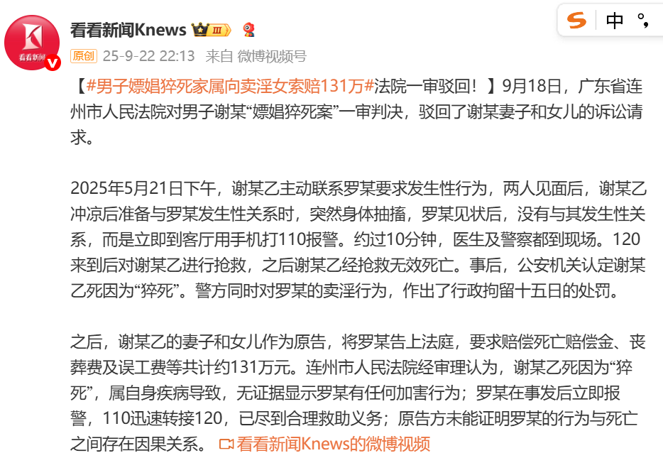 9月22日,據(jù)上海電視臺“@看看新聞Knews”消息,9月18日,廣東省連州市人民法院對男子謝某“嫖娼猝死案”作出一審判決。裁判文書網(wǎng)顯示,5月21日,謝某主動聯(lián)系羅某要求發(fā)生性行為,兩人見面后,謝某沖涼后準備發(fā)生性關系時突然身體抽搐,羅某見狀后,立即到客廳撥打110報警。醫(yī)護人員趕到后對謝某進行搶救,謝某經(jīng)搶救無效死亡。警方認定謝某死因為“猝死”,對羅某的賣淫行為,作出行政拘留十五日的處罰。事后,謝某的妻子和女兒將羅某告上法庭,要求賠償死亡賠償金、喪葬費及誤工費等共計約131萬元。連州市人民法院經(jīng)審理認為,謝某死因為“猝死”,屬自身疾病導致,無證據(jù)顯示羅某有任何加害行為;羅某在事發(fā)后當即報警并配合120搶救,已盡到合理救助義務;原告方未能證明羅某的行為與死亡之間存在因果關系。據(jù)此,該法院駁回謝某妻子和女兒的全部訴訟請求。