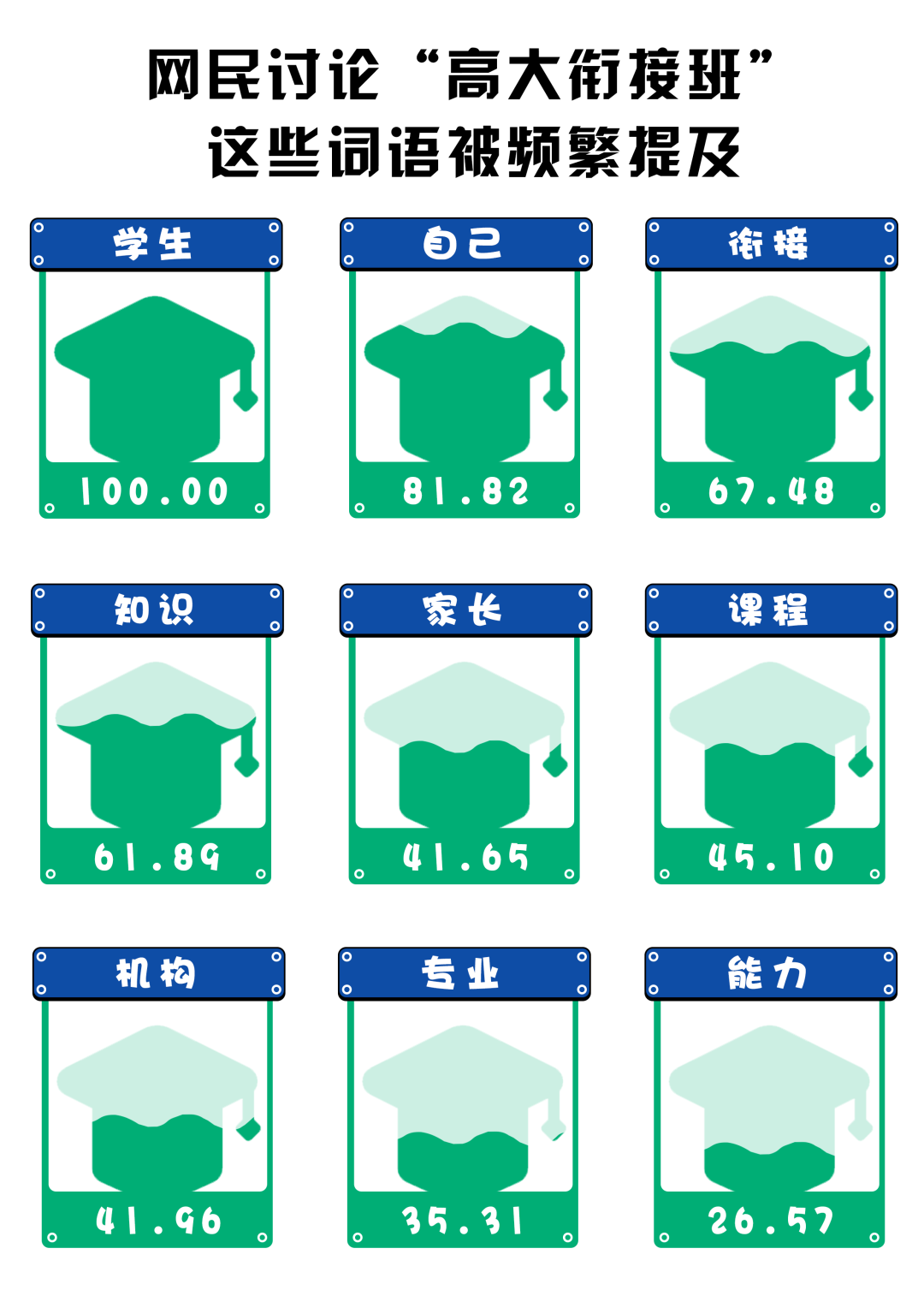 (數(shù)據(jù)來(lái)源:選取知乎話(huà)題“培訓(xùn)機(jī)構(gòu)推出‘高大銜接班’,為大一新生補(bǔ)習(xí)大學(xué)知識(shí),暑假補(bǔ)課真能‘贏在大學(xué)起跑線(xiàn)’嗎?”下的172個(gè)回答,做分詞及歸一化處理,進(jìn)行分詞后將熱度最高的詞語(yǔ)規(guī)定為100)