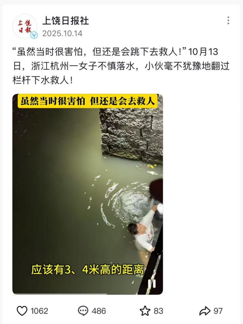 10月14日,“上饒日報社”抖音賬號報道稱,10月13日,浙江杭州一女子不慎落水,小伙毫不猶豫地翻過欄桿下水救人,并配發(fā)救人視頻。該視頻引起部分網(wǎng)民關(guān)注,多數(shù)網(wǎng)民為男子救人行徑點贊。