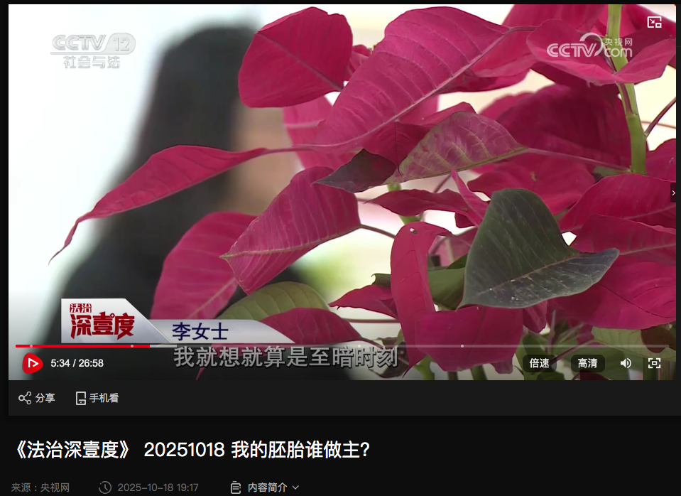 10月18日,央視社會(huì)與法頻道《法治深壹度》節(jié)目播發(fā)專題報(bào)道《我的胚胎誰做主?》,報(bào)道一起喪偶婦女輔助生殖權(quán)益案。據(jù)介紹,福建李女士在丈夫不幸去世后,希望利用夫妻二人在醫(yī)院冷凍保存的胚胎繼續(xù)實(shí)施移植手術(shù),但醫(yī)院鑒于醫(yī)學(xué)倫理問題拒絕了她的請求。隨后李女士將醫(yī)院起訴至法院,一審和二審均被駁回。直至2022年6月,福建省高級(jí)人民法院再審認(rèn)為,李女士要求醫(yī)院為其實(shí)施胚胎移植手術(shù)生育二胎有充分的法律依據(jù),并且還能在精神上撫慰雙方的老人,最終判決醫(yī)院繼續(xù)履行合同,為李女士實(shí)施胚胎移植手術(shù)。該報(bào)道采訪到李女士本人、醫(yī)院代理律師、法學(xué)專家及法官,全面回顧李女士個(gè)人遭遇、情感動(dòng)機(jī)以及案件背后的法理爭議。
