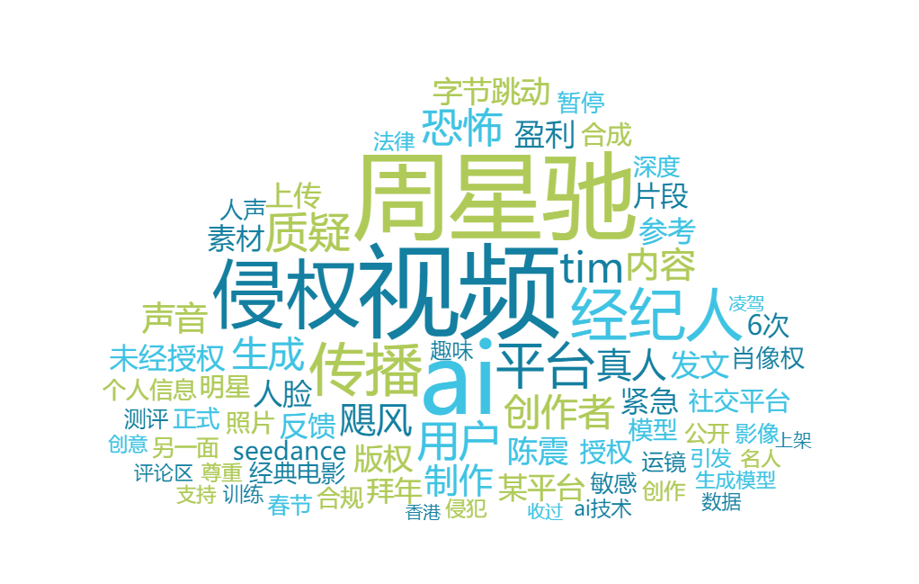 截至2月13日15時,全網(wǎng)相關(guān)信息29338條,“#周星馳經(jīng)紀(jì)人問AI周星馳侵權(quán)嗎#”“#周星馳經(jīng)紀(jì)人呼吁平臺監(jiān)管AI侵權(quán)#”“#律師稱AI周星馳影像標(biāo)注AI也侵權(quán)#”“#即夢暫停參考真人素材生成AI視頻#”“#即夢AI團隊回應(yīng)深知創(chuàng)意的邊界是尊重#”“#面對AI肖像侵權(quán)平臺不能做甩手掌柜#”等相關(guān)微博話題累計閱讀量超2356萬。
