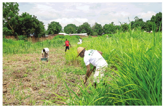 6月1日,在中非共和國首都班吉郊區(qū),當?shù)孛癖姺N植菌草。新華社記者羅毓攝