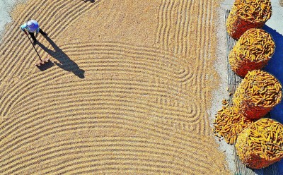 山東省臨沂市郯城縣郯城街道的農(nóng)民在晾曬玉米。 新華社發(fā)