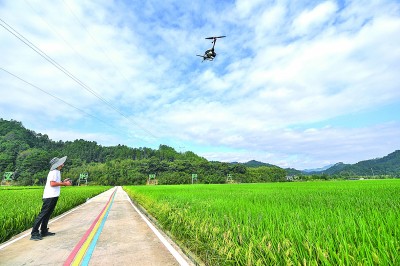 在浙江省杭州市臨安區(qū)太陽鎮(zhèn)的稻田內(nèi),90后新農(nóng)人余岳峰操作農(nóng)用無人機(jī)在田間作業(yè)。 新華社發(fā)