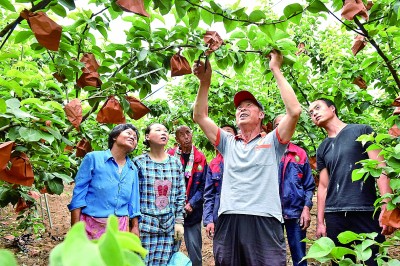 河北省邢臺(tái)市,“農(nóng)民助理技師”劉玉東(前)在梨園對(duì)工人進(jìn)行技術(shù)指導(dǎo)。新華社發(fā)