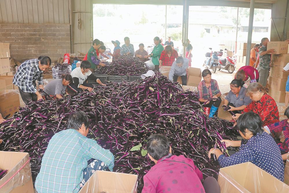在高門(mén)村蔬菜種植基地,工人將茄子、絲瓜等新鮮蔬菜分裝打包 黃娜 攝