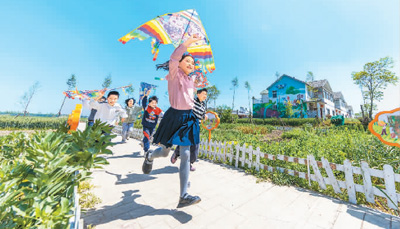 孩子們在江蘇省泗洪縣石集鄉(xiāng)柳山新居“小菜園”放風(fēng)箏 張連華 攝