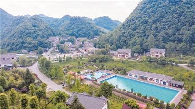 5月25日,走進百里杜鵑戛木管理區(qū)大堰村,國家3A級景區(qū)米底河繞村而過,青山相擁、碧水環(huán)繞、云朵如絮,海恩底度假村內(nèi),錯落有致的民居散落于群山間。文化廣場旁的泳池里,不少避暑游客在這里游泳、燒烤、唱歌,好不愜意。
