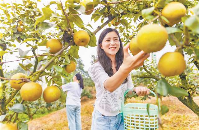 7月4日,巴南區(qū)二圣鎮(zhèn)集體村梨園,游客感受采摘樂趣 通訊員 劉紀(jì)湄 攝