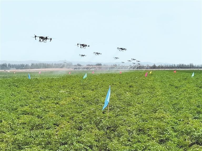 永昌縣聯(lián)聯(lián)眾力農(nóng)機農(nóng)民專業(yè)合作社正在進行無人機飛防作業(yè) 記者 馬國順