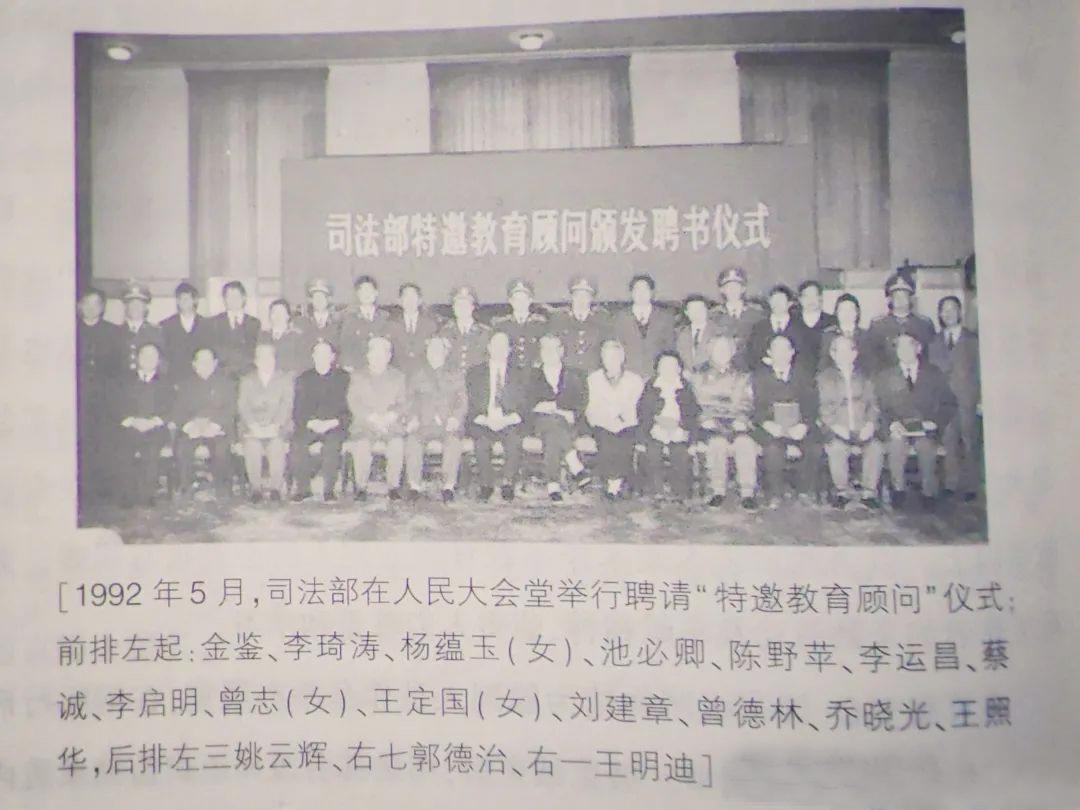 1992年5月,司法部會(huì)同中國(guó)關(guān)心下一代工作委員會(huì),聯(lián)合聘請(qǐng)陳野蘋(píng)、曾志、王照華、池必清、喬曉光、李啟明、李運(yùn)昌、劉建章、何光、曾德林、楊蘊(yùn)玉、張文松、李琦濤、王定國(guó)等十四位老同志擔(dān)任“司法部特邀教育顧問(wèn)”,并在人民大會(huì)堂舉行了隆重的頒發(fā)聘書(shū)儀式。在這批德高望重的革命前輩的熱情參與下,監(jiān)獄管理機(jī)關(guān)的教育改造質(zhì)量和社會(huì)影響力有了新的提升。由于工作原因,我有幸親歷和見(jiàn)證了他們到監(jiān)獄開(kāi)展幫教活動(dòng)的一幕幕感人至深的場(chǎng)景。
