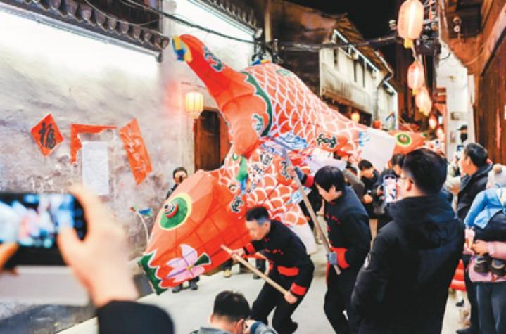 魚(yú)燈隊(duì)在瞻淇村的小巷中巡游