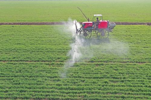 安徽農(nóng)墾華陽河農(nóng)場開展社會化服務的田地里,農(nóng)機手正在進行小麥植保作業(yè)(受訪者供圖)
