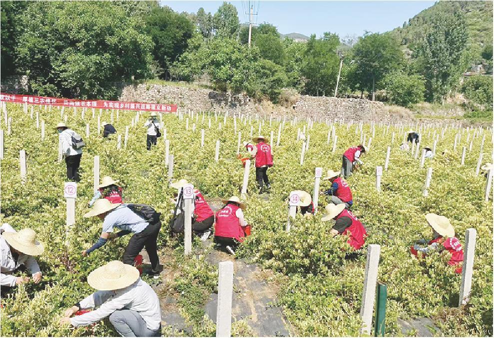 聯(lián)合黨委以黨建為“紅色紐帶”,以潘家場村金銀花基地為核心,協(xié)調周邊村莊土地流轉,推動示范基地建設,帶動十八盤村、白云村、槲疃村等周邊十幾個村實現(xiàn)連片種植3000余畝。統(tǒng)一調配生產(chǎn)要素、統(tǒng)一農(nóng)業(yè)服務、統(tǒng)一管理,形成發(fā)展一個模式、管理一個整體、價格一個標準、銷售一個渠道的發(fā)展合力。