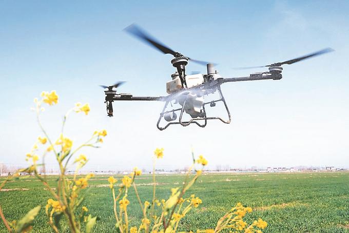 在省農(nóng)墾三河農(nóng)場邱上營分場的麥田里,植保無人機進行飛防作業(yè)。顏懷峰 錢厚紅 攝