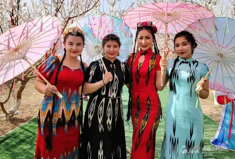 在托克遜縣夏鎮(zhèn)南湖村,游客穿著鮮艷的服裝,在杏樹(shù)下合影留念。尚明 攝