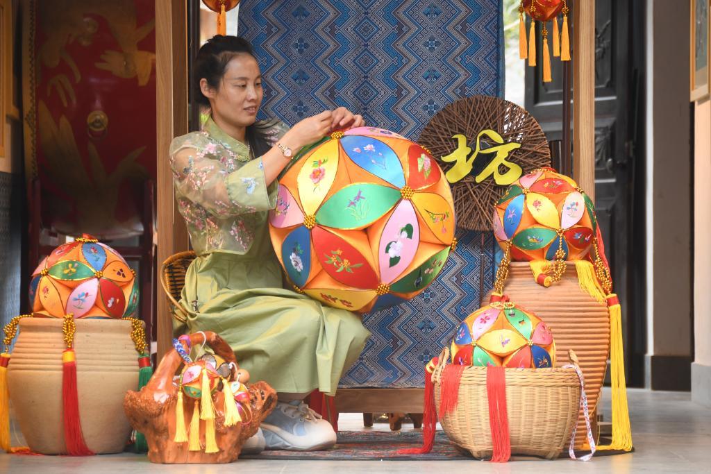 十幾年前,山東聊城的王秀芬來舊州村旅游時(shí),被大街小巷掛滿的繡球深深吸引。一番思索后,計(jì)算機(jī)專業(yè)出身的她決定“跨界”,留在了依山傍水的舊州村,投身到繡球制作事業(yè)中。