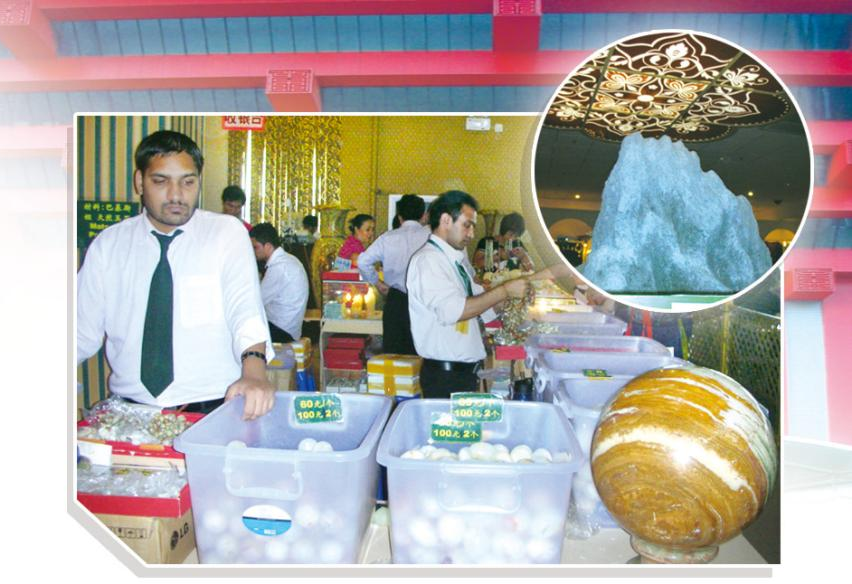 館內(nèi)一面墻,都是有關(guān)特殊年代贈(zèng)予中國的那個(gè)著名的芒果展示,另一面則讓位于婦女地位的宣揚(yáng)。在館內(nèi)我未見到一位巴基斯坦女性,柜臺出售最多的是形態(tài)各異的天然玉石作品。