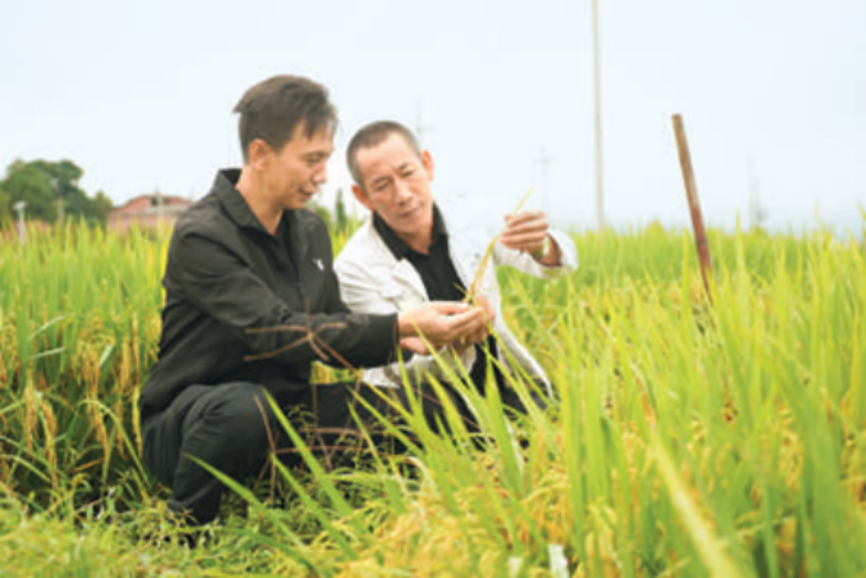 撫州市廣昌縣頭陂鎮(zhèn)頭陂村黨組織書記后備力量符子強(左)向致富能手學(xué)習(xí)水稻種植技術(shù)。