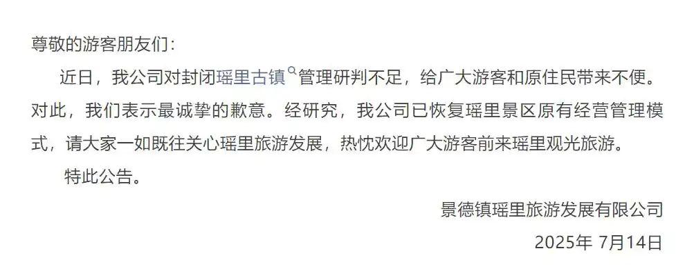 在村民的反對(duì)和輿論關(guān)注下,7月14日,江西省景德鎮(zhèn)市瑤里景區(qū)發(fā)布公告稱,近日,我公司對(duì)封閉瑤里古鎮(zhèn)管理研判不足,給廣大游客和原住民帶來不便。對(duì)此,我們表示最誠摯的歉意。經(jīng)研究,我公司已恢復(fù)瑤里景區(qū)原有經(jīng)營管理模式,請(qǐng)大家一如既往關(guān)心瑤里旅游發(fā)展,熱忱歡迎廣大游客前來瑤里觀光旅游。