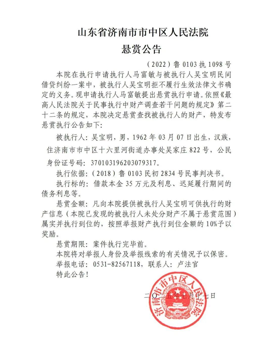 本院在執(zhí)行申請執(zhí)行人馬富敏與被執(zhí)行人吳寶明民間借貸糾紛一案中,被執(zhí)行人吳寶明拒不履行生效法律文書確定的義務?,F(xiàn)申請執(zhí)行人馬富敏提出懸賞執(zhí)行申請。依照《最高人民法院關(guān)于民事執(zhí)行中財產(chǎn)調(diào)查若干問題的規(guī)定》第二十二條的規(guī)定,本院決定懸賞查找被執(zhí)行人的財產(chǎn),特發(fā)布懸賞執(zhí)行公告如下: