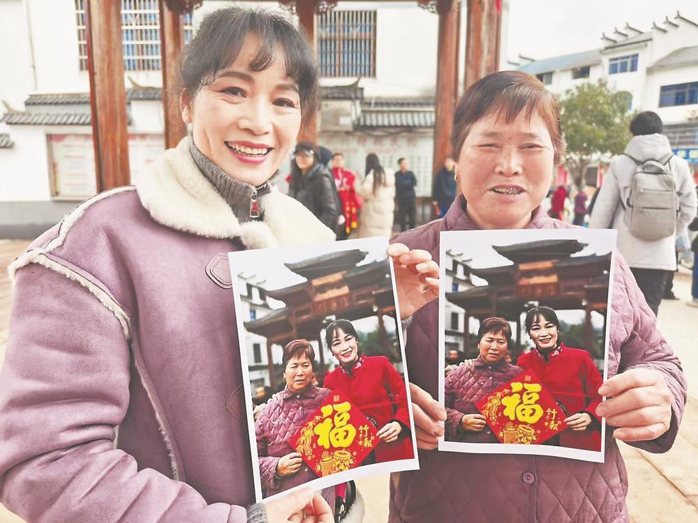 在泰寧縣下渠鎮(zhèn)文化廣場(chǎng),文藝志愿者為村民拍攝全家福。