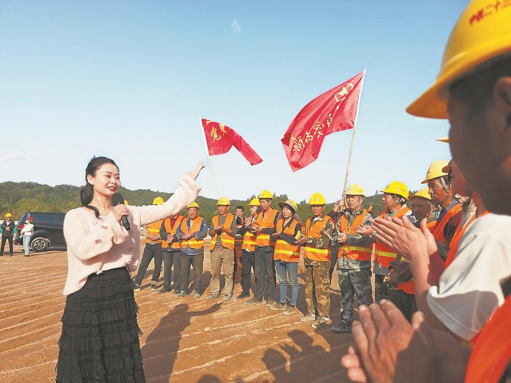 在明溪縣胡坊互通建設(shè)工地上,“遠(yuǎn)山三人行”文藝志愿服務(wù)隊(duì)把歡歌笑語(yǔ)帶到筑路工人身旁。