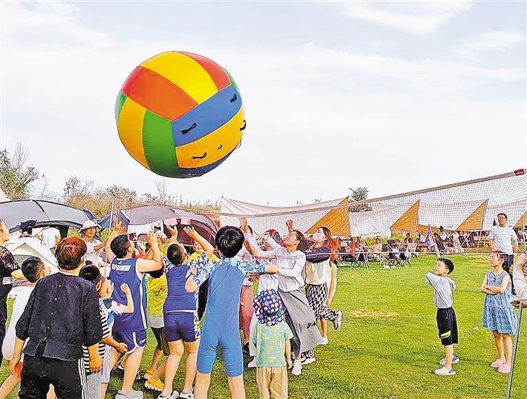 銀川市金鳳區(qū)良田鎮(zhèn)一家露營地,游客正在打“草坪排球”。