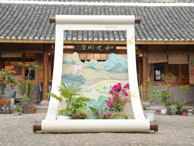 茅洋農(nóng)民畫主題館,坐落于白巖下村和光院,簡單質(zhì)樸的木結(jié)構(gòu)建筑如同形象質(zhì)樸的農(nóng)民畫一樣完美融入這片土地。碩大的藝術(shù)畫框裝置像土地生長的藝術(shù)容器,既有農(nóng)民畫扎根土地的滾燙,也有文創(chuàng)產(chǎn)品帶著絢麗色彩奔赴日常的輕盈。