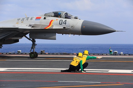 遼寧艦起飛助理做出放飛手勢,殲-15艦載戰(zhàn)斗機(jī)起飛。張凱 攝