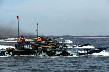 兩棲裝甲裝備件泛水編波訓(xùn)練。王瑋 攝