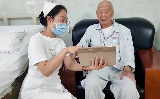 圖為護(hù)士給孫文信老人進(jìn)行床旁手術(shù)宣教。