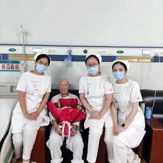 圖為孫文信老人手術(shù)成功后醫(yī)護(hù)人員給他送上祝福的鮮花。