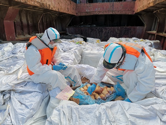 圖為海警執(zhí)法員對凍品取樣檢疫。
