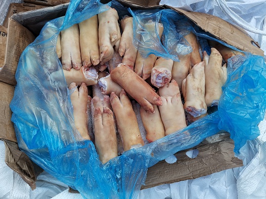 當(dāng)日上午8時許,廣東海警局接群眾舉報,在廣東江門臺山市烏豬島對開海域有人進行涉嫌走私活動。該局立即指派廣東江門海警局執(zhí)法艇前往目標海域進行查緝。9時30分許,執(zhí)法員在目標海域成功攔截該艘目標船舶,經(jīng)登臨檢查發(fā)現(xiàn),船上共有5人,船艙內(nèi)裝有大量白色塑料袋,袋內(nèi)紙箱裝有豬肚、豬蹄、牛肚等凍品約130噸,船上人員均無法提供該批凍品的合法來源及檢驗檢疫證明,涉嫌走私。