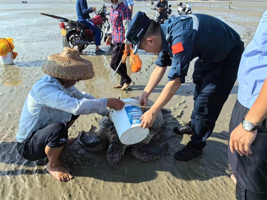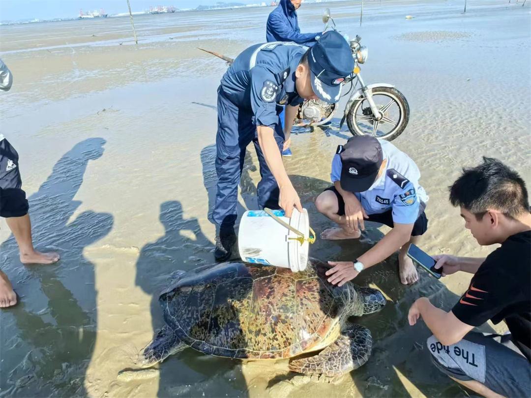 為避免綠海龜遭受二次傷害,執(zhí)法員一邊清理附近沙石雜物,一邊采用水桶澆水方式對(duì)其進(jìn)行保濕。觀察一段時(shí)間后,綠海龜生命體征和行動(dòng)能力開(kāi)始逐漸恢復(fù),隨即被送至安全開(kāi)闊海域放生。