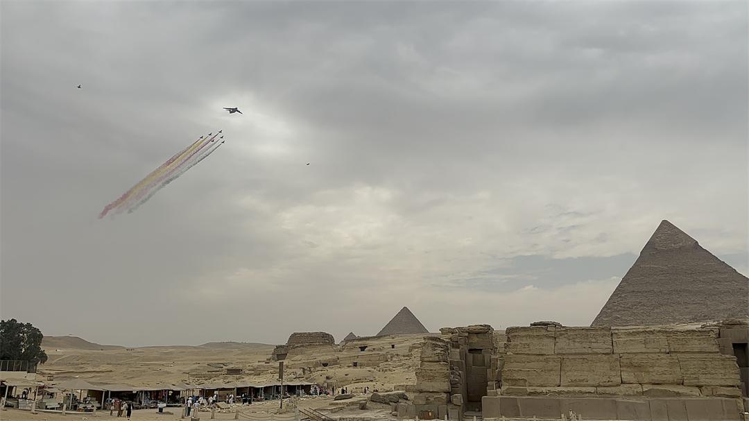 開羅當?shù)貢r間8月28日中午時分,受邀參加首屆埃及航展的中國空軍1架運-20與八一飛行表演隊6架殲-10表演機編隊飛越金字塔,在空中拉出象征中埃兩國國旗顏色的六道彩煙。