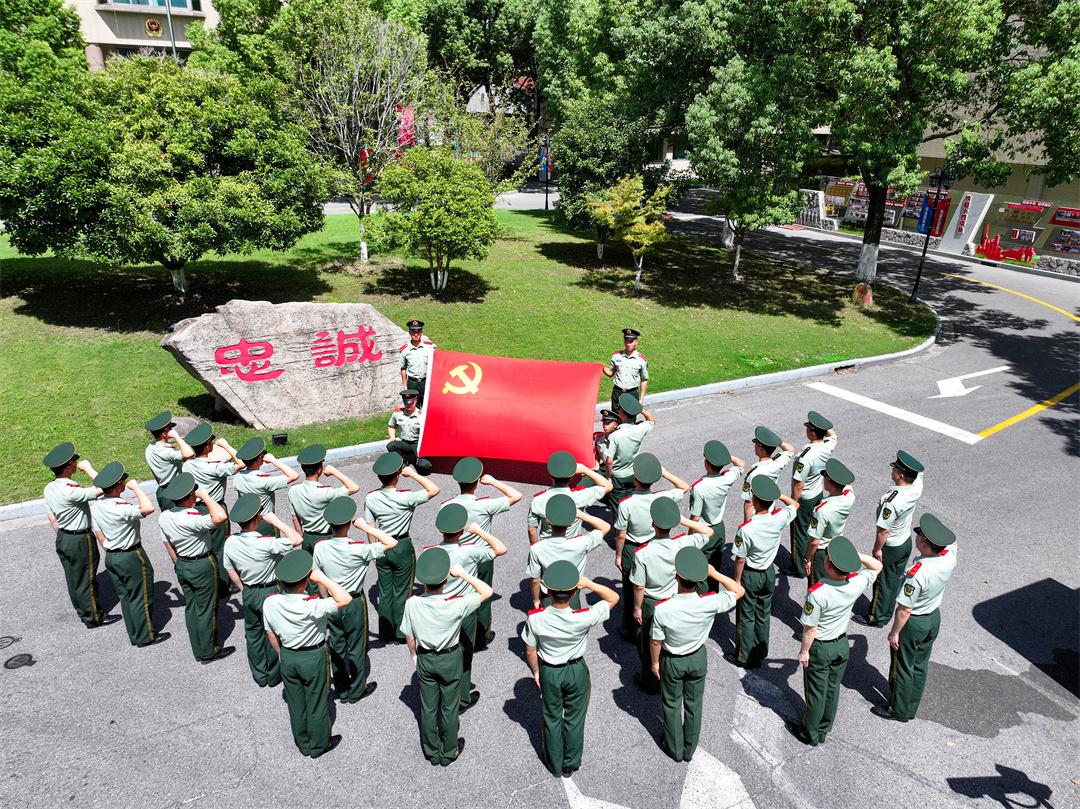 圖為中隊預(yù)備黨員面對黨旗莊嚴(yán)宣誓。