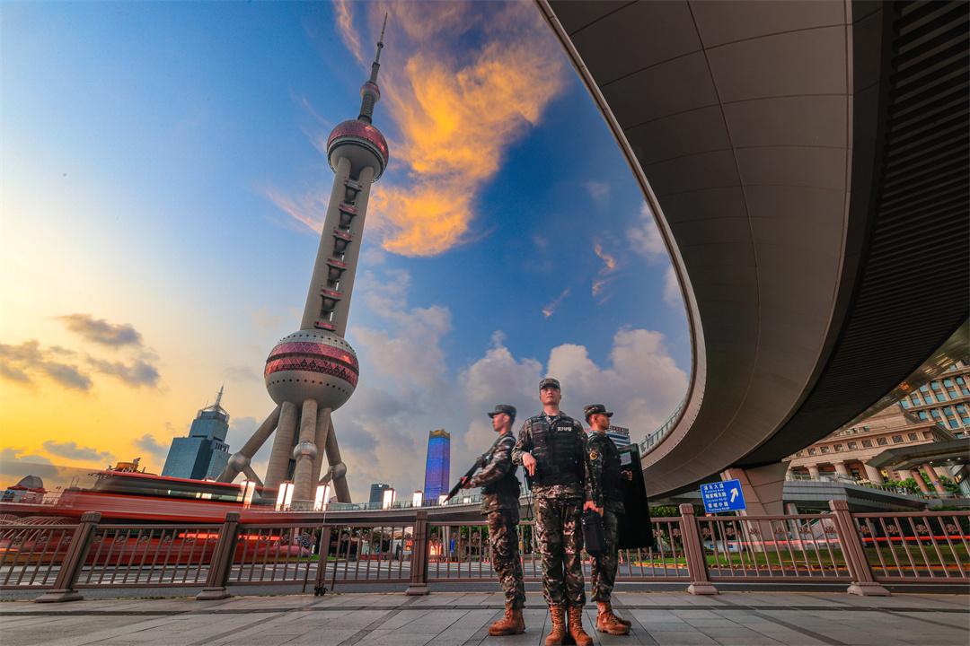 迎著霞光,武警上??傟爤?zhí)勤第二支隊某中隊巡邏車穿梭在上海市浦東新區(qū)陸家嘴金融貿(mào)易區(qū),這里是官兵常年守護的地方。