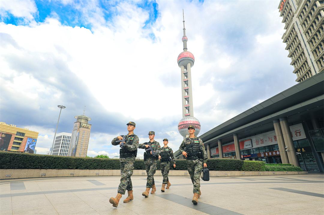 圖為中隊官兵在陸家嘴金融區(qū)徒步巡邏。