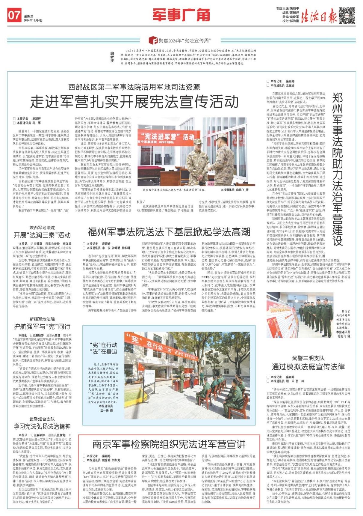 為全面落實(shí)“誰(shuí)執(zhí)法誰(shuí)普法”普法責(zé)任制,解放軍南京軍事檢察院近日安排部署“12·4”國(guó)家憲法日及“憲法宣傳周”期間法治宣傳活動(dòng),組織開(kāi)展憲法宣誓、憲法進(jìn)軍營(yíng)宣講等形式多樣的系列宣傳活動(dòng),讓憲法走到官兵身邊、走進(jìn)官兵心里。