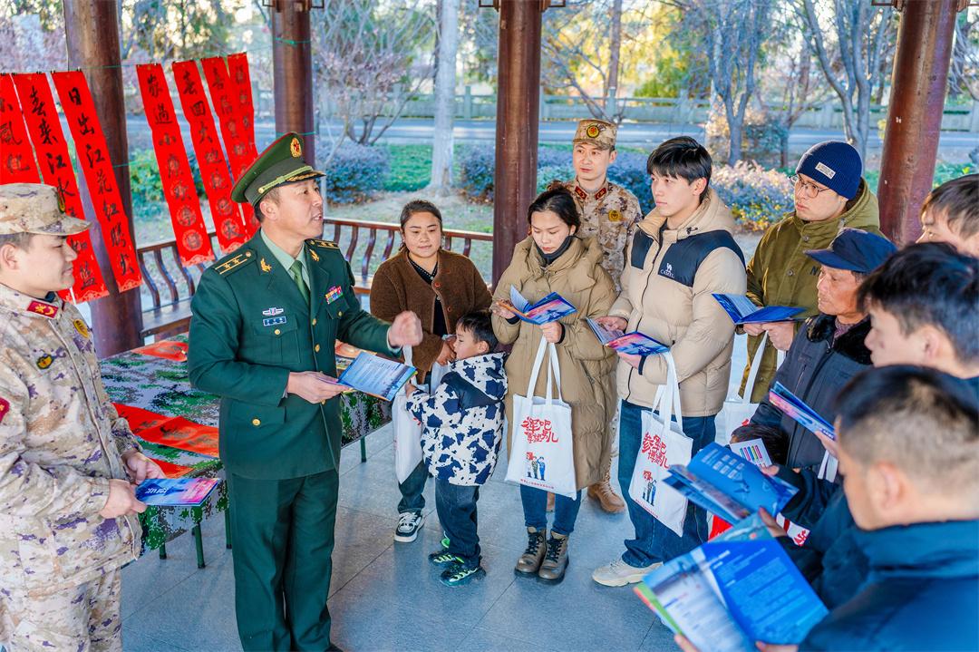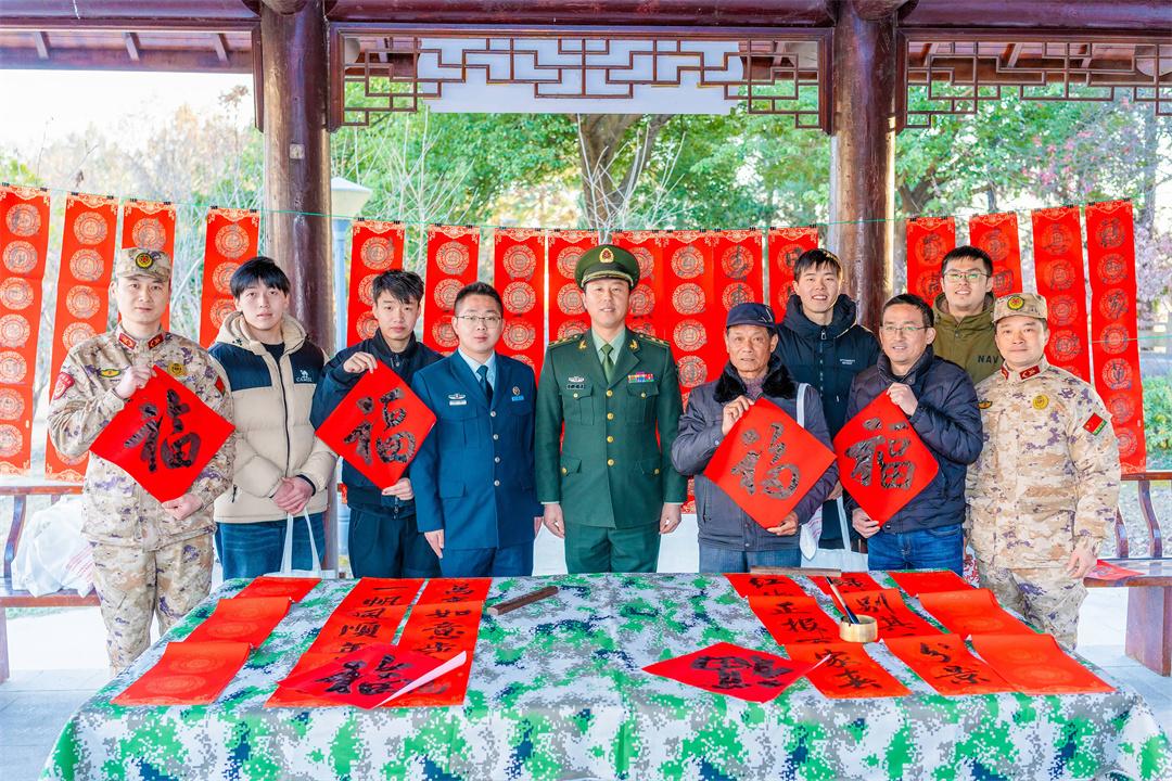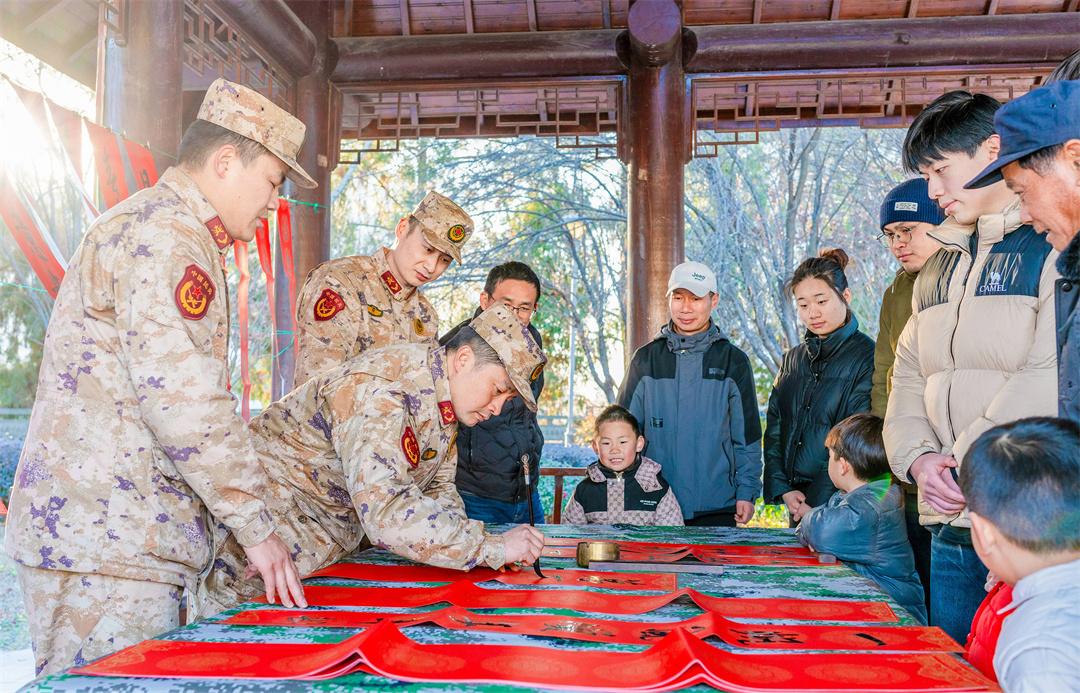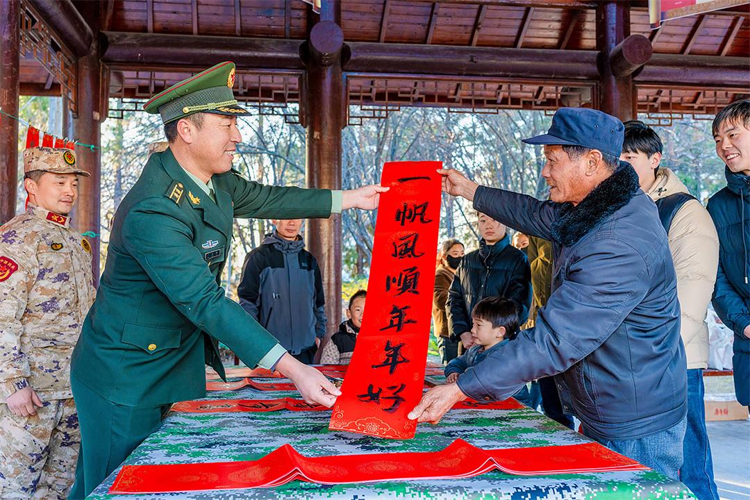 1月15日,安徽省馬鞍山市博望區(qū)人武部組織現(xiàn)役官兵、文職人員、基干民兵走進(jìn)村鎮(zhèn)文化中心廣場,開展“寫春聯(lián)·送祝?!び麓骸蔽繂枌m椈顒?。圖為官兵給駐地群眾送上新春祝福。