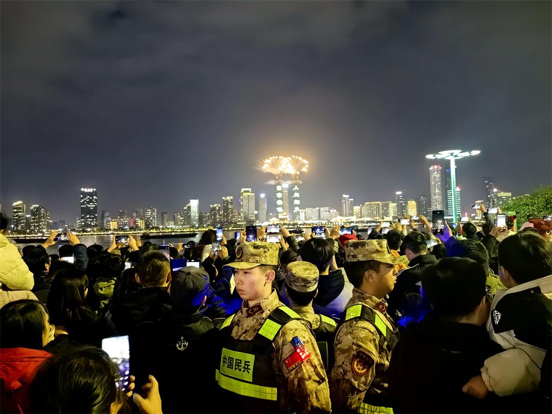 值得一提的是,此次迎春煙花晚會活動有不少民兵主動請纓,要求上崗執(zhí)勤?!叭f家燈火時,正是我們守護的時刻,能與戰(zhàn)友們一起為大家的歡樂保駕護航,這是我的驕傲?!眻?zhí)勤民兵周道堅定地說。現(xiàn)場,各點位執(zhí)勤民兵沿著護欄整齊地“一”字形散開,定點執(zhí)勤與巡邏警戒雙管齊下,時刻保持警惕,不放過任何異常情況。