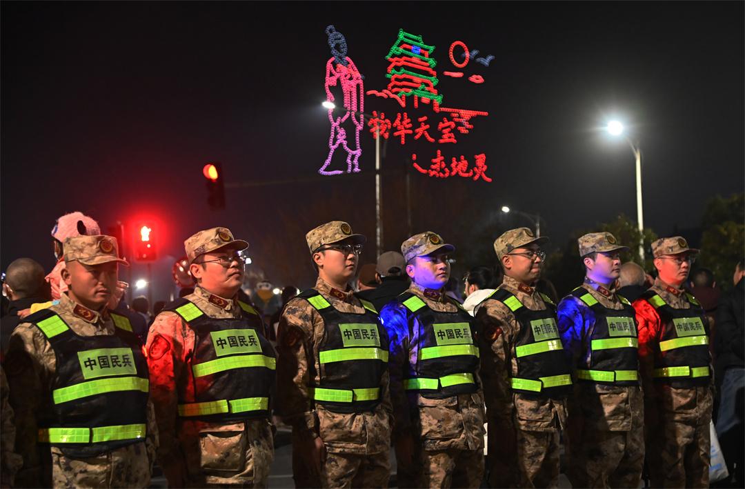隨著夜幕降臨,活動周邊區(qū)域人流、車流驟增。民兵們有的化身貼心引導員,耐心為游客提供引導咨詢;有的疏導人流,用有力的雙手和耐心的勸導,確保人群有序流動。在重要路口和通道,民兵組成人墻引導人群分批通過,避免擁堵和踩踏事故發(fā)生。