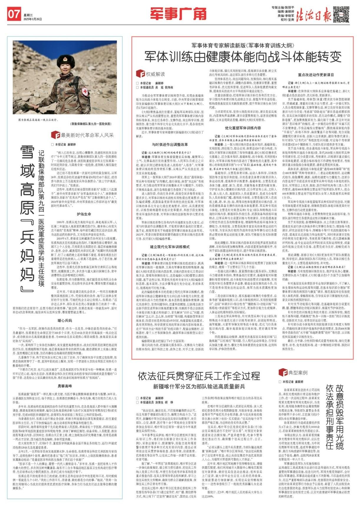 林建棣:上一版大綱訓(xùn)練內(nèi)容由基本知識、基礎(chǔ)體能、實用技能、崗位能力、綜合應(yīng)用、體育活動6個部分構(gòu)成,為部隊開展軍體訓(xùn)練提供了指導(dǎo)和遵循。新《大綱》在繼承優(yōu)長基礎(chǔ)上,區(qū)分基本知識、基礎(chǔ)體能、戰(zhàn)斗體能、實用技能4部分,對軍體訓(xùn)練考核內(nèi)容進(jìn)行了整體性優(yōu)化重塑,其中核心的體能類課目按“1+1+X”體系(基礎(chǔ)體能、通用戰(zhàn)斗體能、軍兵種專項戰(zhàn)斗體能)進(jìn)行架構(gòu)。