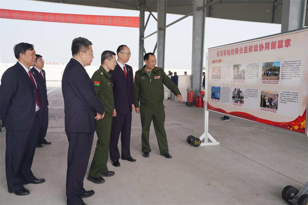 圖為與會人員參觀軍地檢察公益訴訟為保護軍事設施取得的成績。