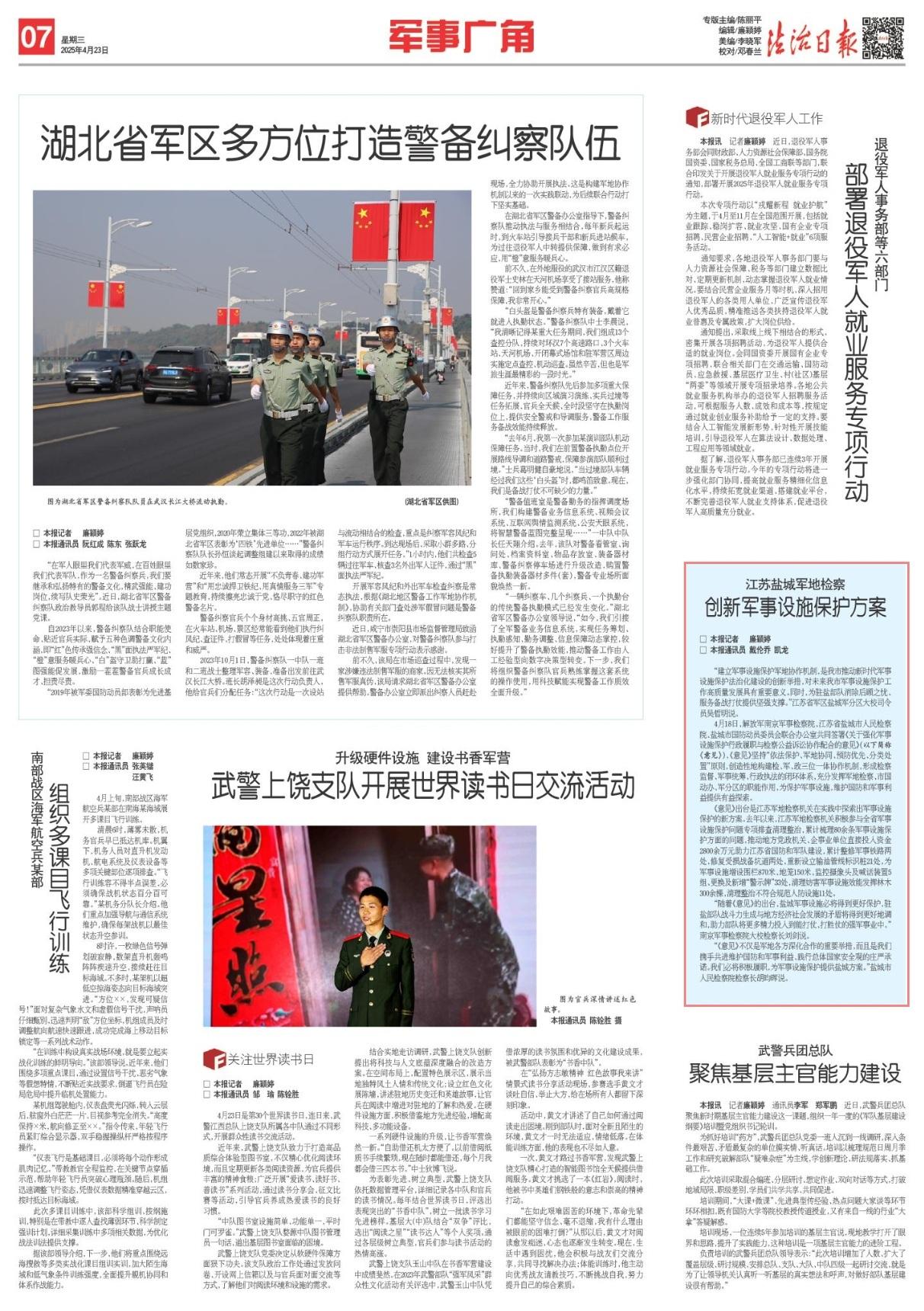 4月18日,解放軍南京軍事檢察院、江蘇省鹽城市人民檢察院、鹽城市國防動員委員會聯(lián)合辦公室共同簽署《關于強化軍事設施保護行政履職與檢察公益訴訟協(xié)作配合的意見》(以下簡稱《意見》),《意見》堅持“依法保護、軍地協(xié)同、預防優(yōu)先、分類處置”原則,創(chuàng)造性地構建檢、軍、政三位一體協(xié)作機制,形成檢察監(jiān)督、軍事統(tǒng)籌、行政執(zhí)法的閉環(huán)體系,充分發(fā)揮軍地檢察、市國動辦、軍分區(qū)的職能作用,為保護軍事設施,維護國防和軍事利益提供有益探索。